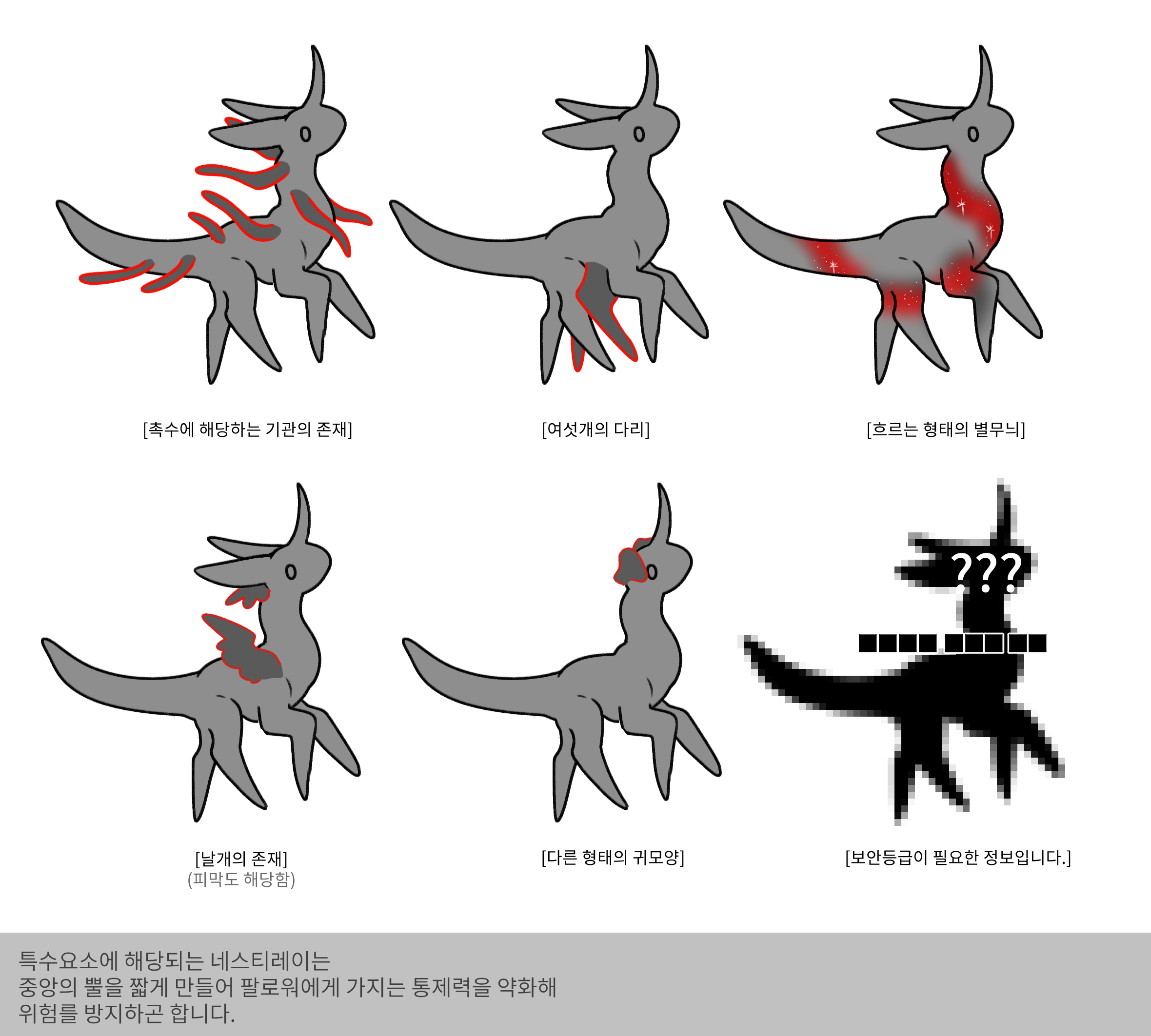 - 네시의 특수요소에 해당하는 내용들은(ex.촉수) 설정상 희귀한 요소이나 디자인시 특별한 제약은 두고있지 않습니다.