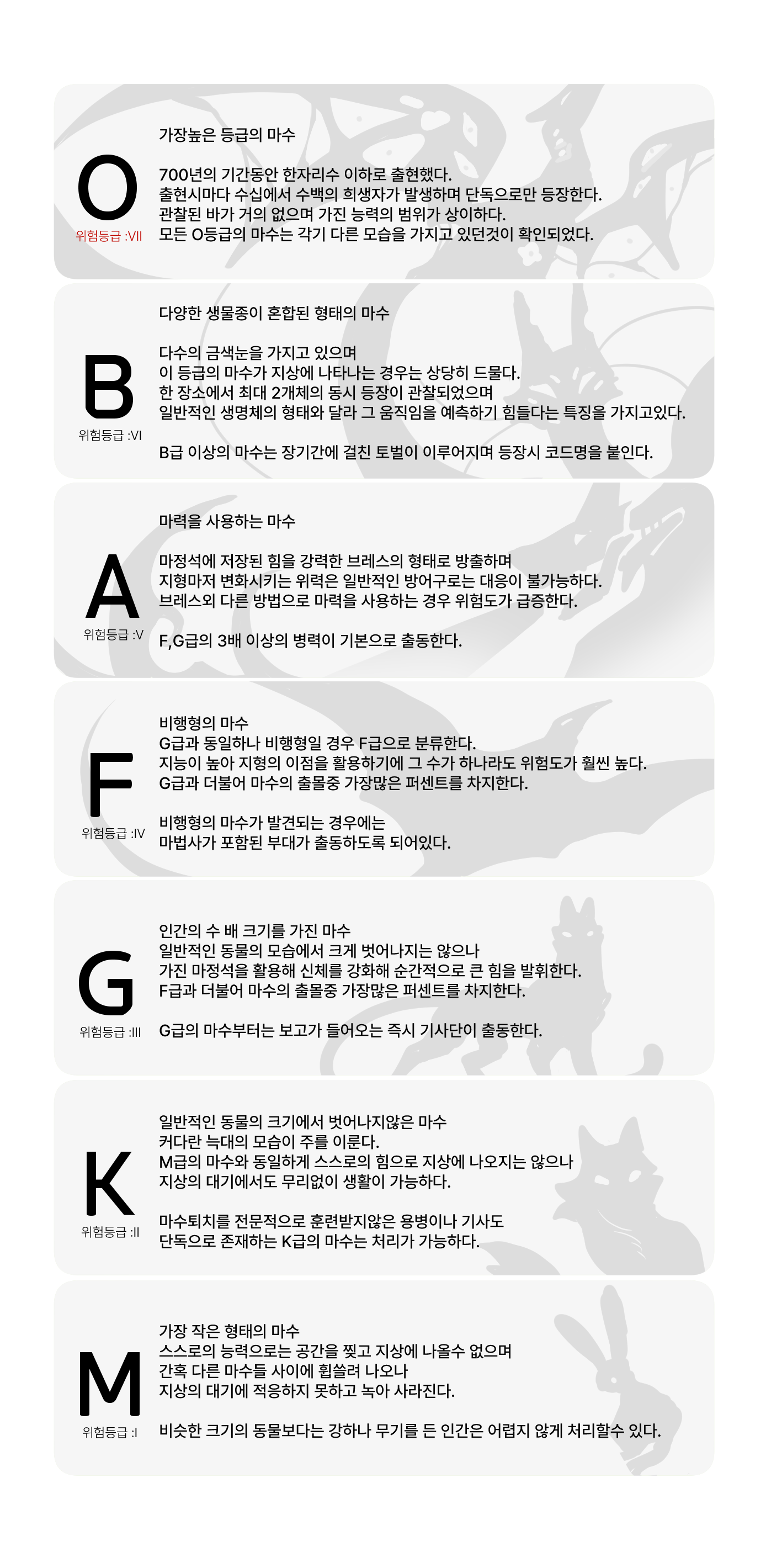 마수는 강함과 사용하는 능력에 따라 OBAFGKM 의 등급으로 나누어 분류하며 그중 가장 강력한 마수를 O등급으로 부른다.